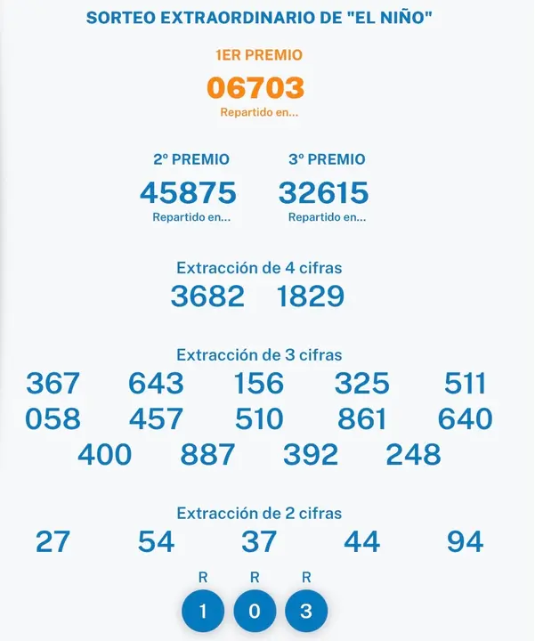 El 06703 el primer premio del Sorteo del Niño Actualidad El 06703 el primer premio del Sorteo del Niño m Siguiente Redacción 06/01/26 - 12:22 Actualizado: 06/01/26 - 12:23 Sorteo completo Redacción Actualidad