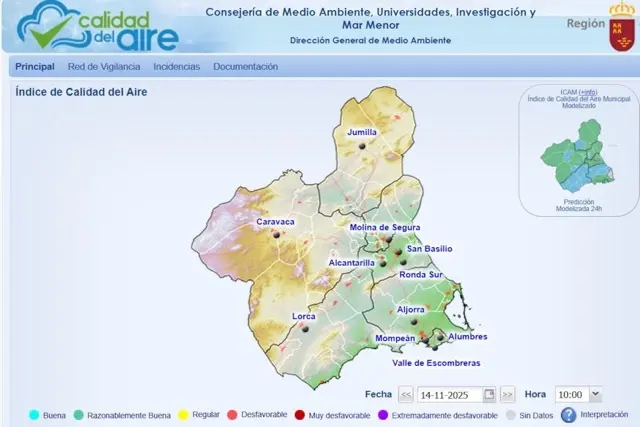 La Dirección General de Medio Ambiente de la Comunidad Autónoma de Murcia ha informado al Ayuntamiento de Cartagena de que en la jornada de este jueves 13 de noviembre se registró el Nivel 1 (Preventivo) para las partículas PM10 en las estaciones de medida de Mompean, La Aljorra y Alumbres, y Nivel 3 (Alerta) en la estación de medida de Valle de Escombreras.