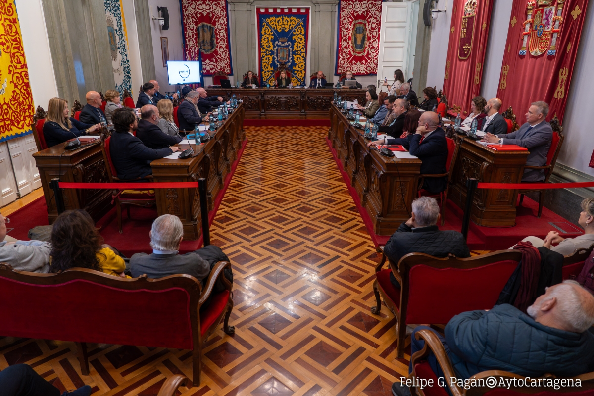 El pleno de la corporación municipal se ha reunido este jueves 12 de febrero en sesión extraordinaria, bajo la presidencia de la alcaldesa, Noelia Arroyo, para proceder a la aprobación inicial del Plan General de Ordenación Urbana de Cartagena, que finalmente ha salido adelante con los votos a favor de PP, VOX, PSOE y la edil no adscrita María Dolores Ruiz, en contra de MC Cartagena y la abstención del grupo Mixto-Sí Cartagena.