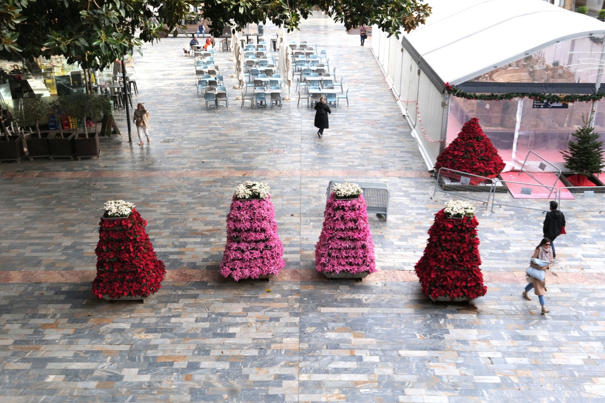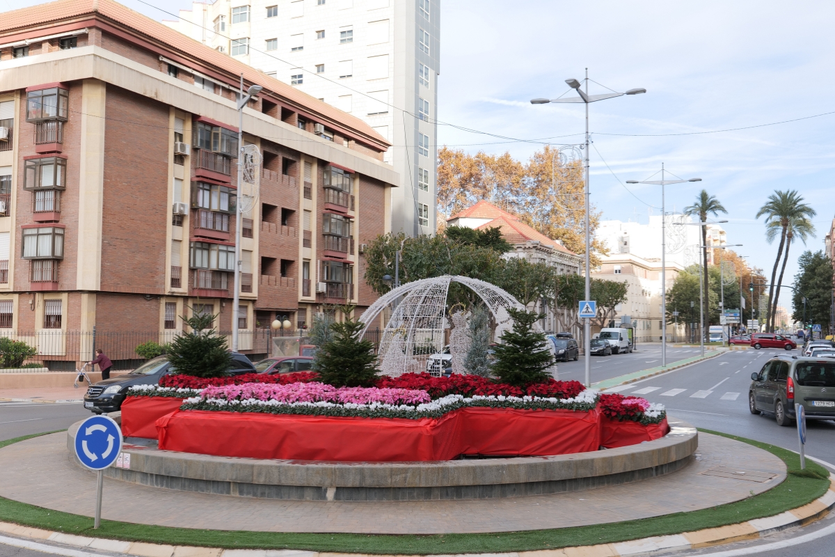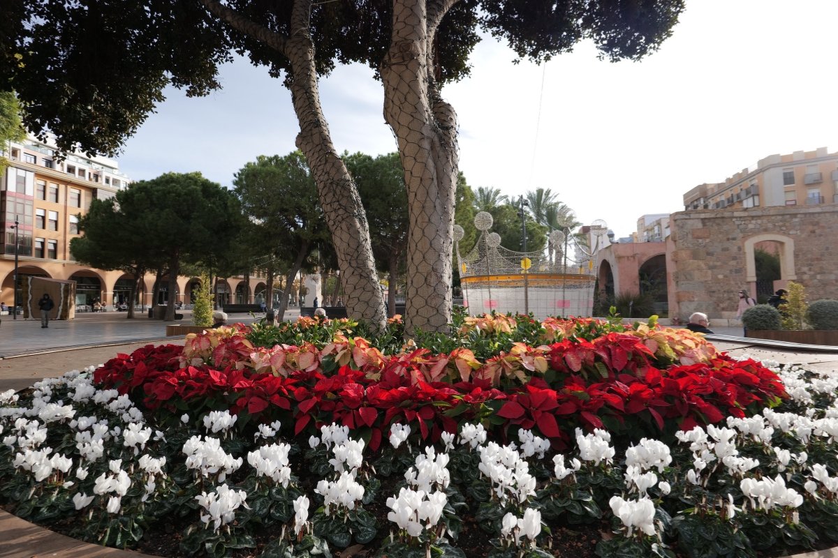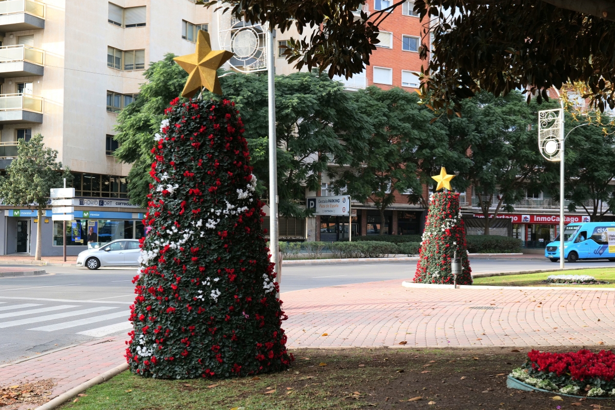 La decoración navideña se amplía además con nuevos elementos ornamentales distribuidos por distintos espacios emblemáticos del municipio, entre ellos los conos con ciclamen rojo y blanco instalados en Plaza de España y en Roche Alto; los árboles metálicos decorados con poinsettia roja y prinsettia blanca en Pozo Estrecho, la rotonda del Escudo y el Belén Municipal; así como las estructuras piramidales situadas en Plaza San Francisco y en la Plaza del Ayuntamiento. Además, tres fuentes de la ciudad se llenarán también de flores: la de calle Carlos III, la de Plaza de España y la de la Alameda de San Antón.