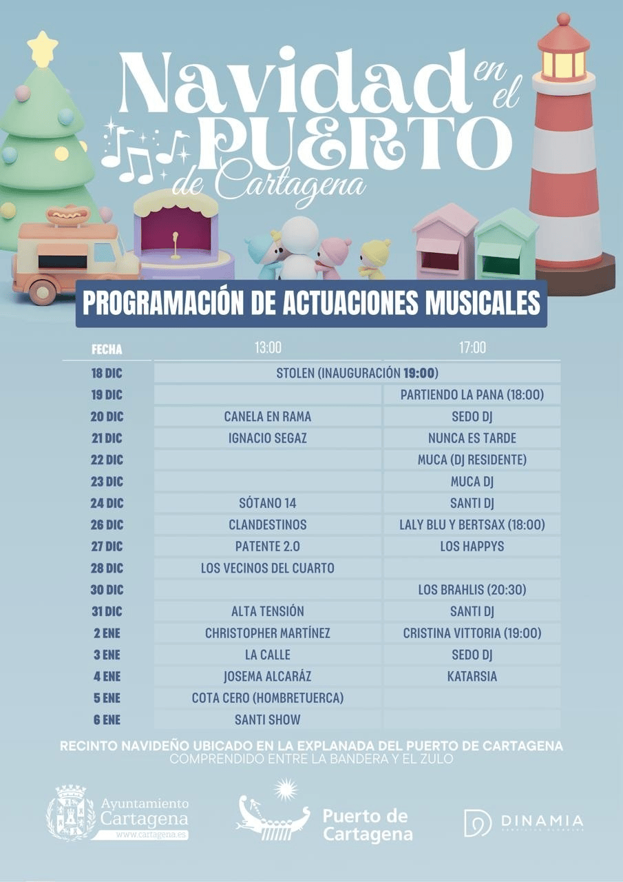 Asimismo, la música también será protagonista con los conciertos del tenor Pablo Martínez y el Conservatorio de Música de Cartagena, este viernes 19, a las 19:30 horas, en el belén a tamaño real de la plaza antiguas Puertas de Madrid o el concierto de la Unión Musical Cartagonova ese mismo día, a las 21:00 horas, en El Batel. También se han programado otros espectáculos, como el del Gran Circo Acrobático de China o el musical de Coco en El Batel, además de Las Guerras K-POP, la magia de Abraham Gallego, Asesinato en Orient Express o el villano de la Navidad en el Teatro Circo Apolo de El Algar.