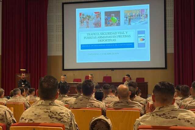El objetivo de esta formación es reforzar la coordinación entre la ESPAC y las Fuerzas Armadas y mejorar la preparación del personal militar en materia de tráfico y seguridad vial de cara a una de las pruebas deportivas más multitudinarias de Cartagena.