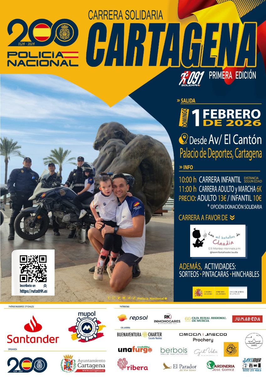 Carera solidaria 091 Cartagena, a partir de las 11:00 horas. La Comisaría de Policía Nacional de Cartagena, con la colaboración del Ayuntamiento, celebra este evento deportivo solidario con más de 1500 participantes. Se ha establecido una modalidad infantil y una marcha popular para adultos. Todos los beneficios irán destinados a la entidad sin ánimo de lucro Las mil batallas de Claudia. Partirá del Palacio de Deportes (Avenida del Cantón) y discurrirá por las calles Soldado Rosique, Alameda San Antón,Plaza de España, Menéndez y Pelayo, Real, Paseo Alfonso XII, Plaza Héroes de Cavite, Plaza del Ayuntamiento, Mayor, Plaza San Sebastián, Puertas de Murcia, Carmen, Puertas de Madrid, Plaza España, Alameda, Soldado Rosique y regresará al Palacio Consistorial. Más información en www.lineadesalida.net