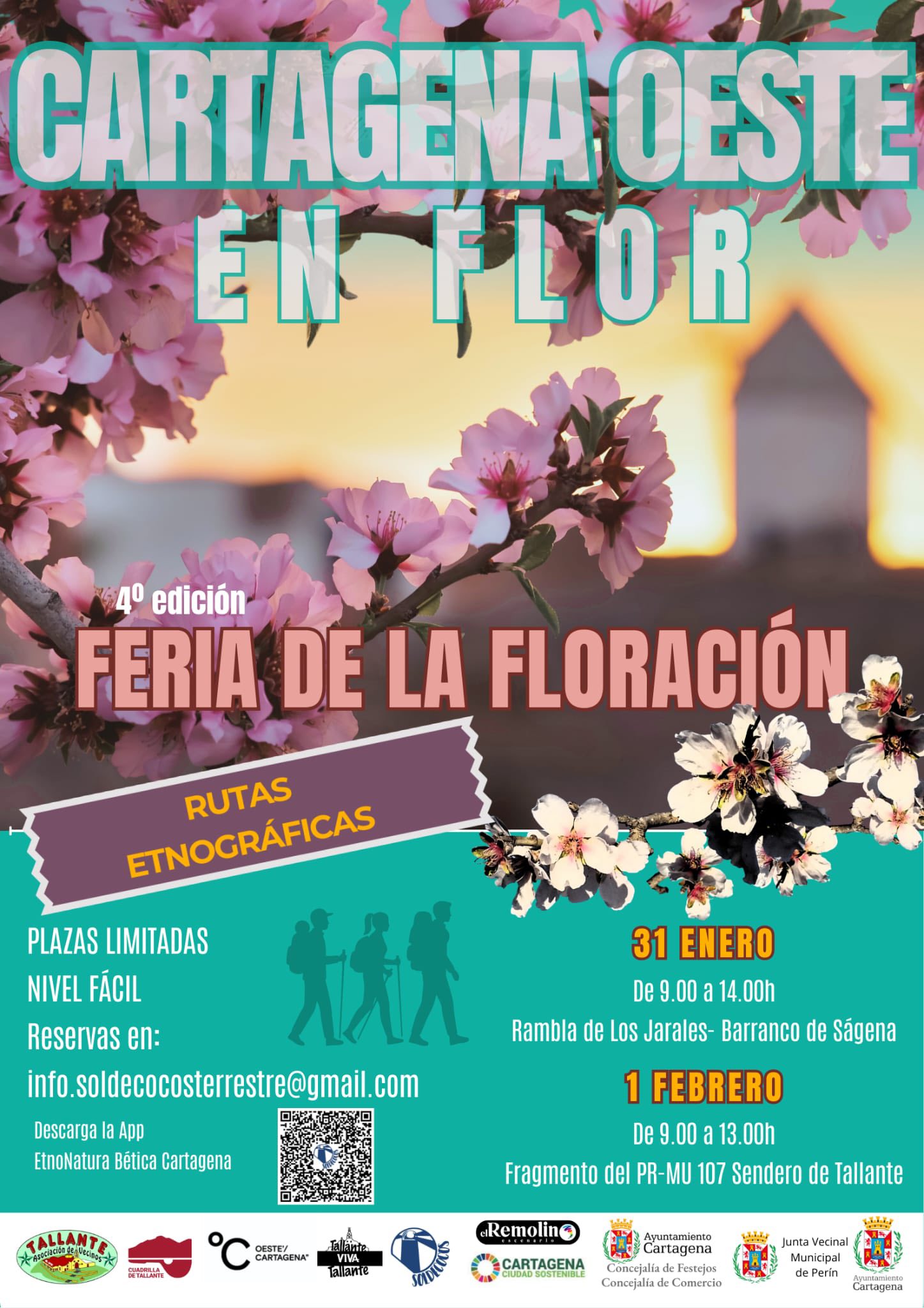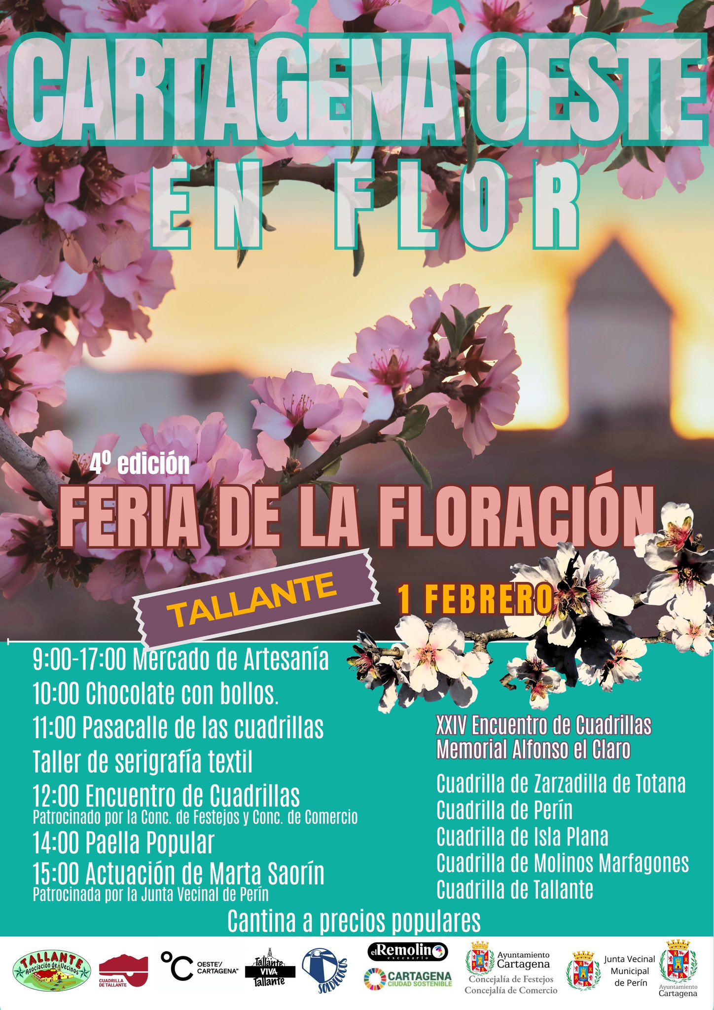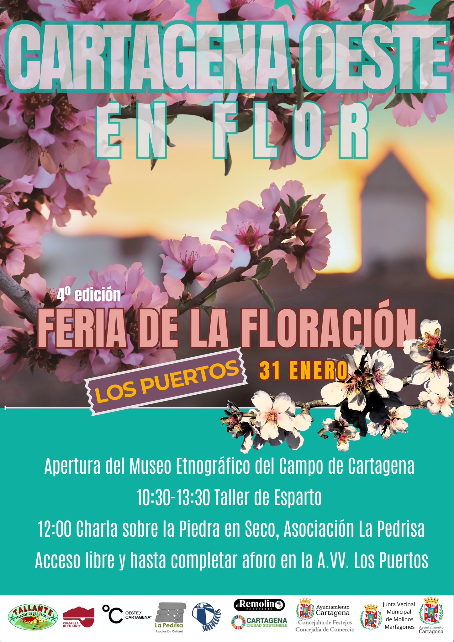 Asimismo, los interesados podrán disfrutar de la IV feria Cartagena Oeste en Flor los días 31 de enero y 1 de febrero, organizada por la Asociación de Vecinos de Tallante y otras entidades de la zona, con la colaboración del Ayuntamiento. Se celebrará en Los Puertos y Tallante con rutas etnográficas, encuentro de cuadrillas, mercado de artesanía, talleres, conciertos.