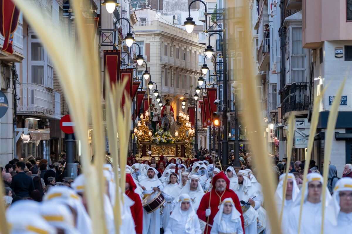 La tradicional procesión de la Entrada de Jesús en Jerusalén, conocida popularmente como La Burrica o la procesión de Las Palmas, volvió a recorrer este Domingo de Ramos las calles del centro de Cartagena con el protagonismo absoluto de los más pequeños de la Cofradía California.