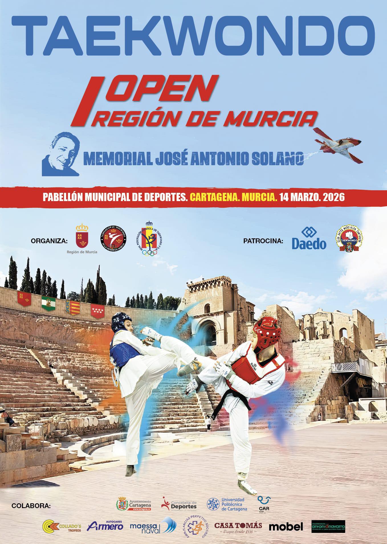 Taekwondo. I Open Nacional Región de Murcia - Memorial José Antonio Solano, de 8 a 15 horas, en el pabellón Wssell de Guimbarda. El evento, avalado por la Real Federación Española de Taekwondo, se disputará en formato cuadrangular, Madrid-Valencia-Andalucía-Murcia, con un total de 250 participantes de las categorías Cadete y Júnior. Además, a media mañana se realizará un homenaje a José Antonio Solano, figura clave del taekwondo regional y nacional, como símbolo de recuerdo en el aniversario de su partida. La entrada para disfrutar de la competición es libre, hasta completar aforo.