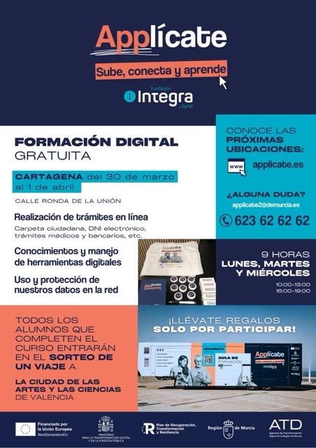 Cartagena, 24 de marzo de 2026. La unidad móvil del programa de formación gratuita en competencias digitales Applícate: Sube, conecta y aprende, promovido por la Fundación Integra Digital y el Gobierno de la Región de Murcia, regresa a Cartagena, del 30 de marzo al 1 de abril, con el objetivo de acercar las nuevas tecnologías a la ciudadanía y facilitar el uso cotidiano de herramientas digitales.