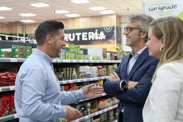 El consejero de Economía, Hacienda, Fondos Europeos y Transformación Digital, Luis Alberto Marín, anunció hoy la prórroga del convenio que mantienen las entidades financieras y la sociedad de garantía recíproca Avalam, acuerdo que sustenta esta línea de crédito, durante su visita a la cadena regional de supermercados Cash Lesco.