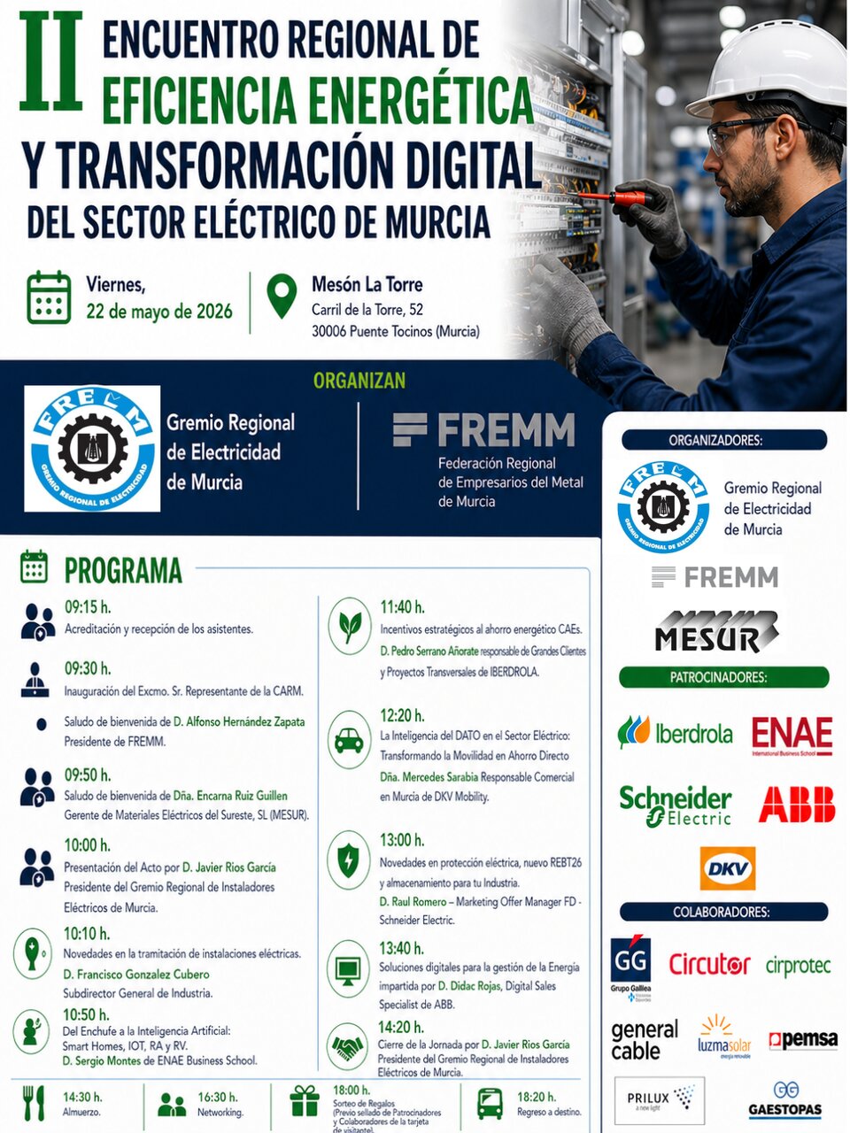 El “II Encuentro de Eficiencia Energética y Transformación Digital del Sector Eléctrico” del Gremio Regional de Instaladores de Electricidad, integrante de la Federación Regional de Empresarios del Metal de Murcia (FREMM), afianzará a los instaladores murcianos en la vanguardia en innovación, ahorro, protección y agilización de trámites.