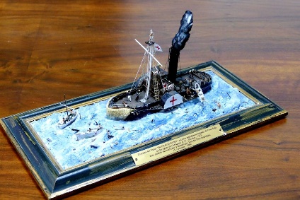 Maqueta del vapor Buenaventura con la Insignia de la Cruz Roja.