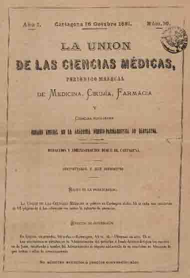 -1881. Comienza a publicarse en Cartagena el periódico mensual "La Unión de las Ciencias Médicas"