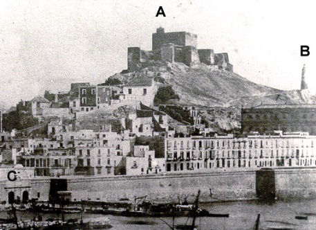 Castillo de la Concepción y Torre de la Linterna señalados como A y B.