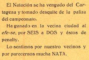 -1926. Primera alusión a la palabra EFESE. En el diario El Eco de Cartagena la crónica se ocupa del partido de vuelta contra los pimentoneros. En el anterior partido jugado el 24 de octubre el Cartagena perdió y en éste estaban muy ufanos los del pimentón.