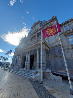 Bandera de la Orden de Santa María de España ondeando en el Ayuntamiento de Cartagena.