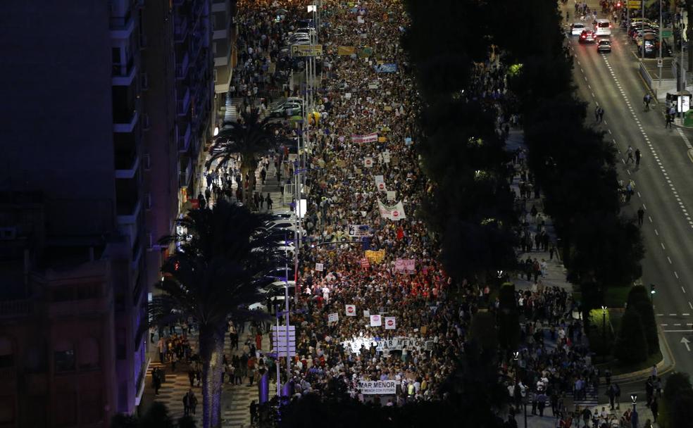 -2019. Miles y miles de personas exigen la recuperación de un espacio que agoniza. Se manifestaron cerca de 55.000 personas, según fuentes policiales, clamando contra la contaminación del Mar Menor pidiendo soluciones definitivas para salvarlo.