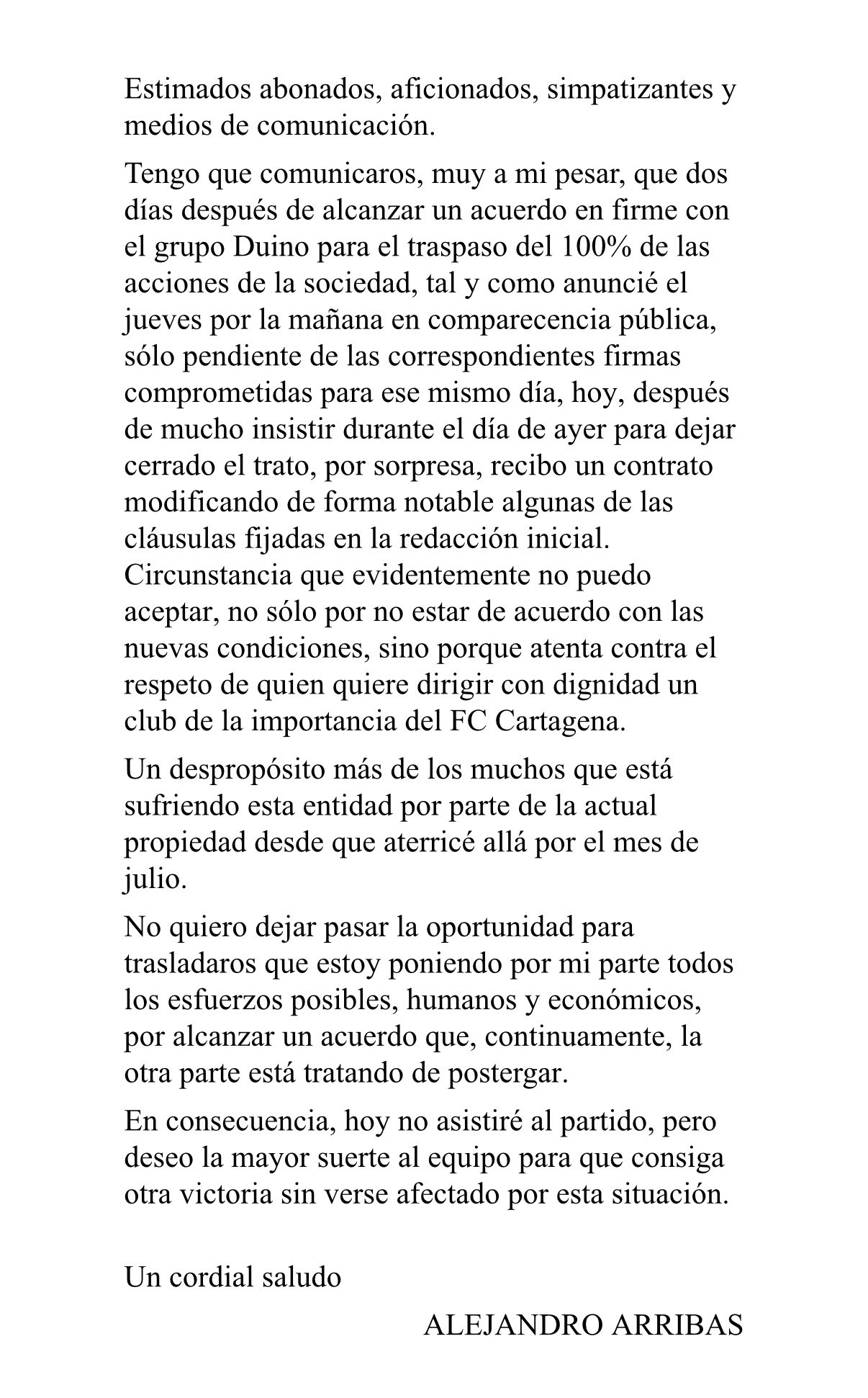 Increíble pero cierto, Alejandro Arribas después de dar la rueda de prensa afirmando la compre venta del Cartagena y adelantando la transición ordenada, e incluso con la despedida de Paco Belmonte y la dirección deportiva de los empleados y cuerpo técnico, arribas en un comunicado por redes sociales afirma que el acuerdo se ha roto. Adjuntamos comunicado, tan solo una horas antes del partido del FC Cartagena ante el Villarreal B de esta tarde.