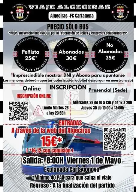 La salida está prevista para el viernes 1 de mayo a las 08:00 horas desde la explanada del Cartagonova, mientras que el regreso se realizará al término del encuentro. Para que el viaje pueda llevarse a cabo será necesario un mínimo de 40 personas inscritas.