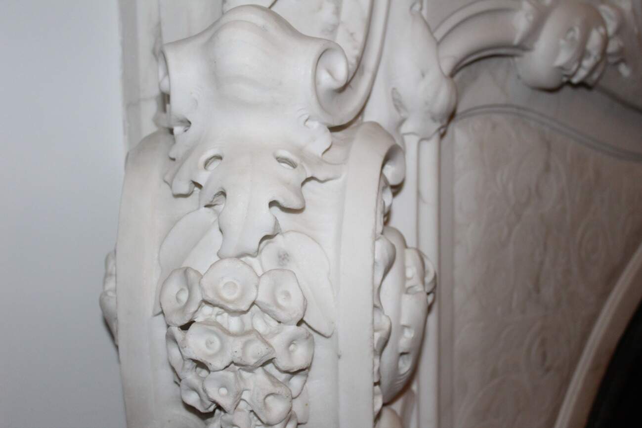 Los suelos de mármol, los techos altos, los miradores, la escalera y las chimeneas. Me cuenta que las chimeneas se compraron en Italia, que son de mármol de Carrara, y que en todo el edificio sólo se conservan esas dos que observo con los ojos muy abiertos.