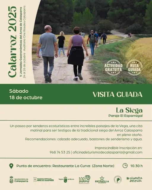 Este sábado 18 de octubre vive “La Siega” en el paraje del Esparragal: un paseo ecoturístico entre los paisajes de la Vega para descubrir en directo la tradicional siega del Arroz de Calasparra y el viernes 24 de octubre descubre el Molino Arrocero “Finca de Soto” (1900) en el paraje del Estanco: una visita guiada al patrimonio agroindustrial de Calasparra para conocer la historia y la tradición artesanal del arroz. Actividades gratuitas con inscripción previa.