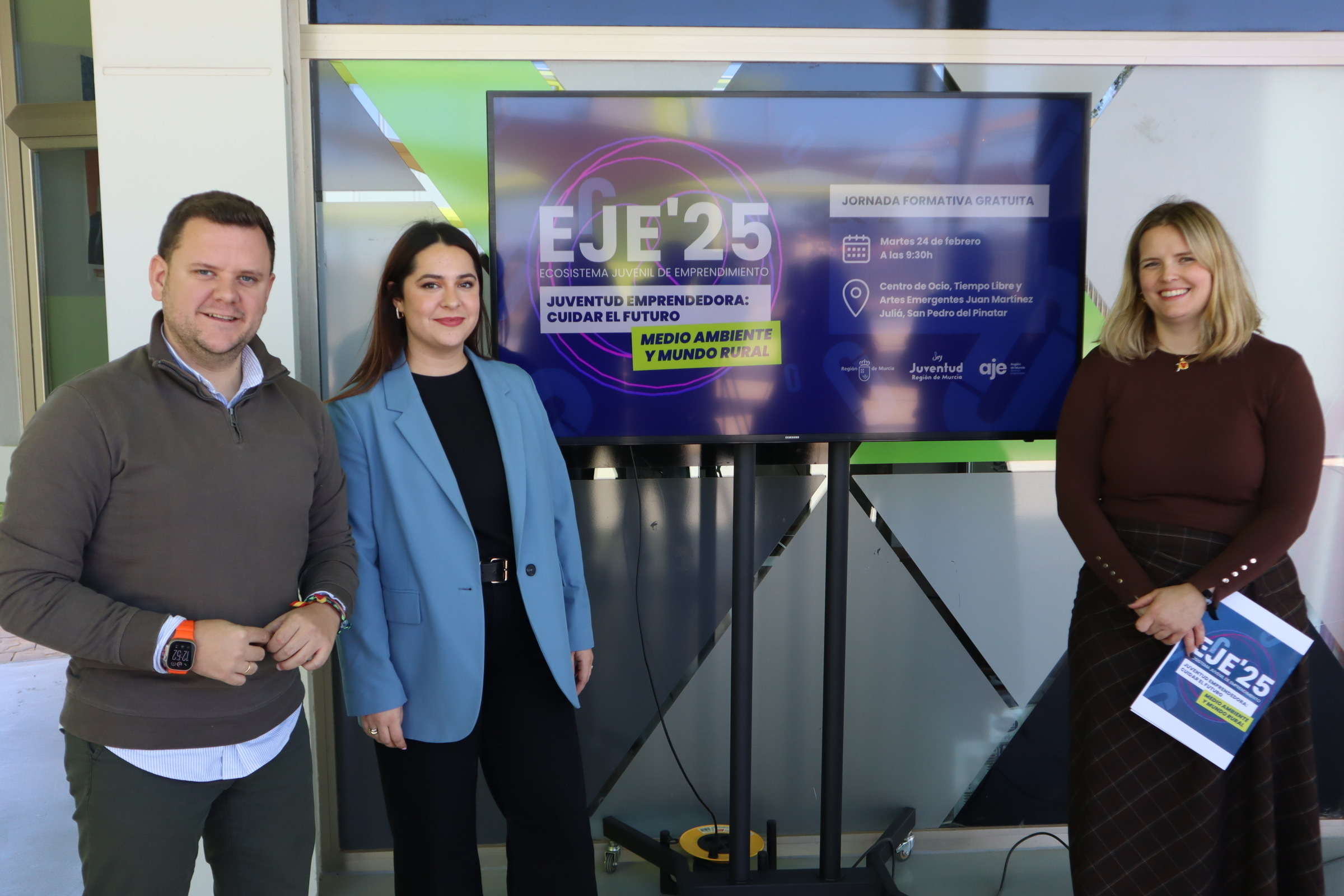 El concejal de Juventud del San Pedro del Pinatar, Valentín Henarejos, ha acompañado a la directora general de Juventud de la Región de Murcia, Carmen María Muñoz y a la presidenta de AJE Región de Murcia, Almudena Abellán, en la presentación, en el Centro de Ocio y Artes Emergentes “Juan Martínez Juliá”, del encuentro “Juventud emprendedora en medioambiente y mundo rural: cuidar el futuro”, una jornada dirigida a jóvenes emprendedores y profesionales interesados en el emprendimiento vinculado al medioambiente y al entorno rural.