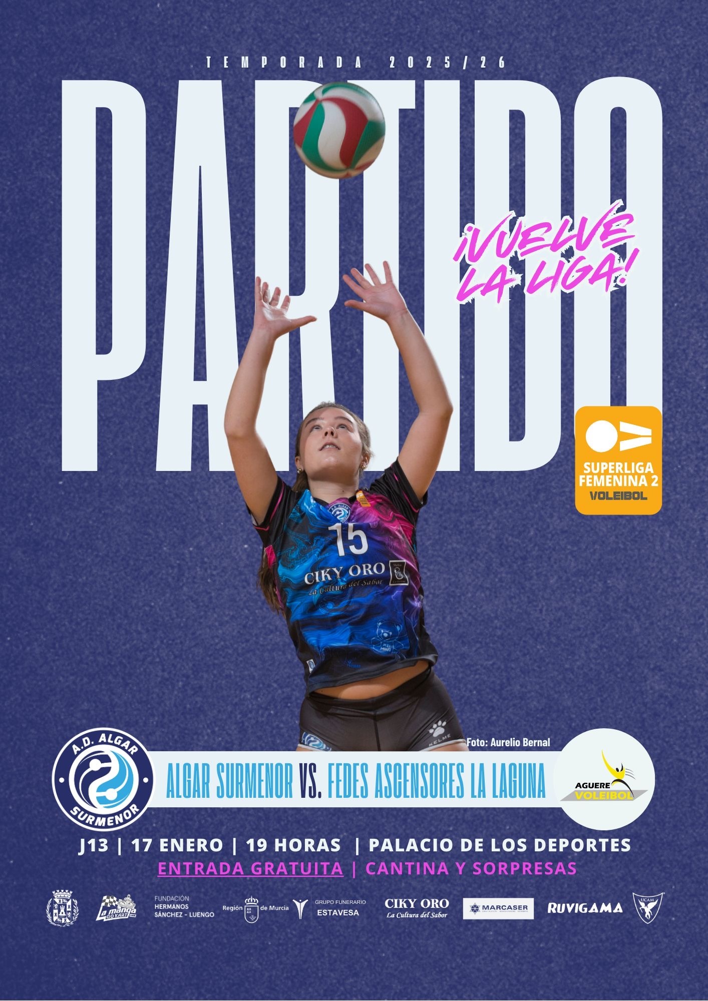 14 de enero. El Algar Surmenor recibe este sábado (19 horas) en el Palacio de los Deportes al todopoderoso Fedes Ascensores La Laguna, uno de los equipos más fuertes del Grupo C de Superliga 2 y que viene de participar en la Copa Princesa 2026. El objetivo: poner distancia de la parte baja de la clasificación.