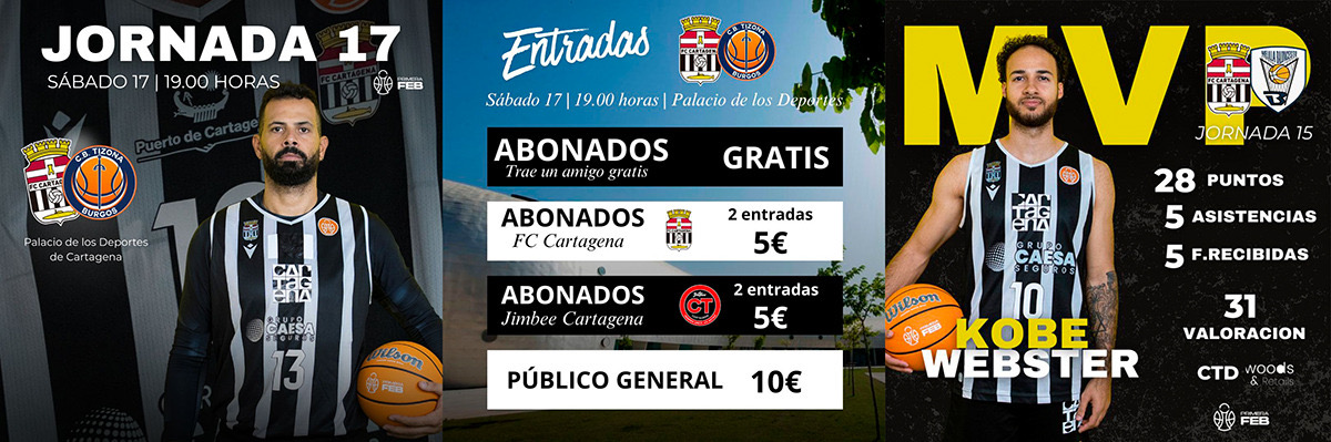 Por otro lado, indicar que el base Kobe Webster ha sido elegido MVP de la pasada jornada en la Primera FEB tras los 28 puntos y 5 asistencias que aportó al Caesa FC Cartagena CB en la victoria en Melilla. También reseñar que el partido frente a los burgaleses comenzará a las 19 horas, la misma en la que en la pista auxiliar del Palacio de Deportes de Cartagena, con entrada gratuita, se enfrentarán AD Algar Surmenor y La Laguna de Tenerife en la Superliga Femenina 2 del voleibol nacional.