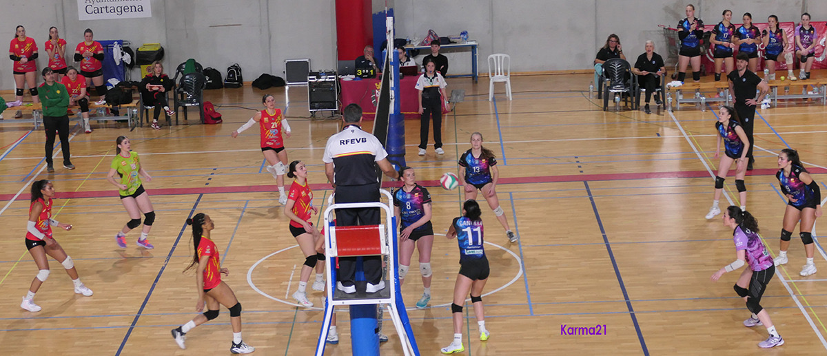 Partido de la jornada 22 (y última de la temporada regular) de la Superliga Femenina de voleibol disputado en la pista auxiliar del Palacio de Deportes de Cartagena. Antes de comenzar el encuentro, hubo un homenaje de la AD Algar Surmenor a Belén Cabrera, quien ha estado cuatro años en el club y ahora deja la práctica del voleibol de alto nivel.