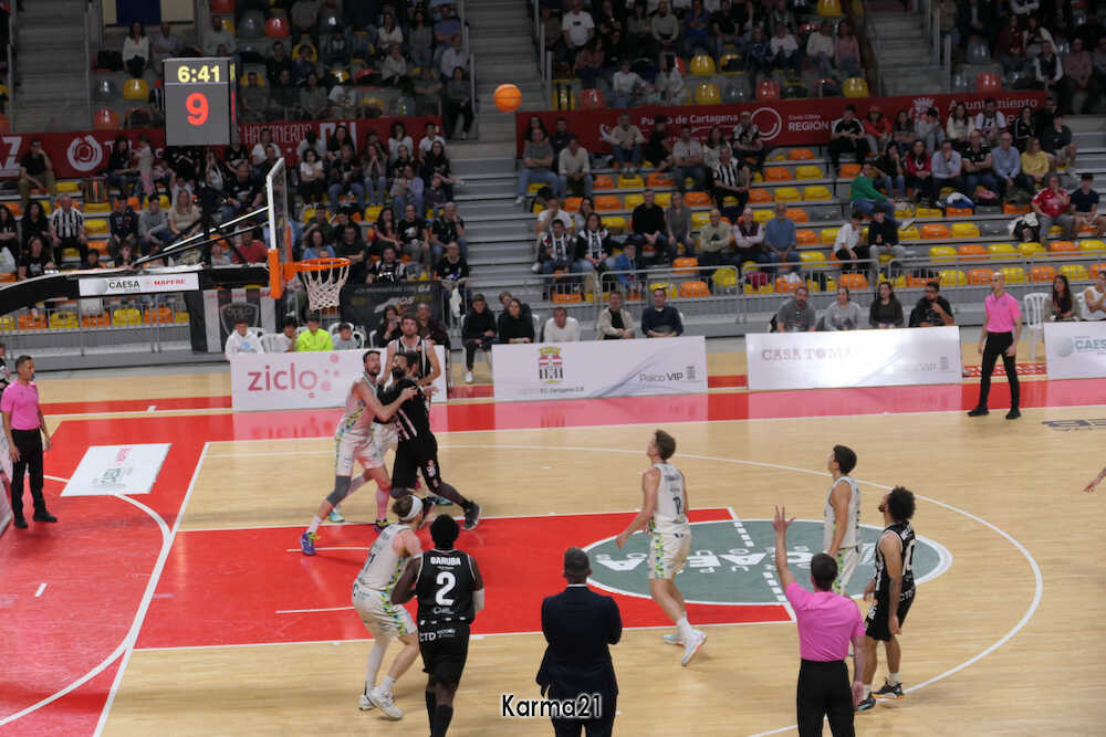 Partido de la jornada 29 de Primera FEB de baloncesto disputado en el Palacio de Deportes de Cartagena ante más de dos mil espectadores, de los que unos quinientos llegaron con el partido empezado. Arbitraron Javier Avila, Ángel Albacete y Alejandro Calvo. Sigue siendo nefasta la megafonía del recinto.