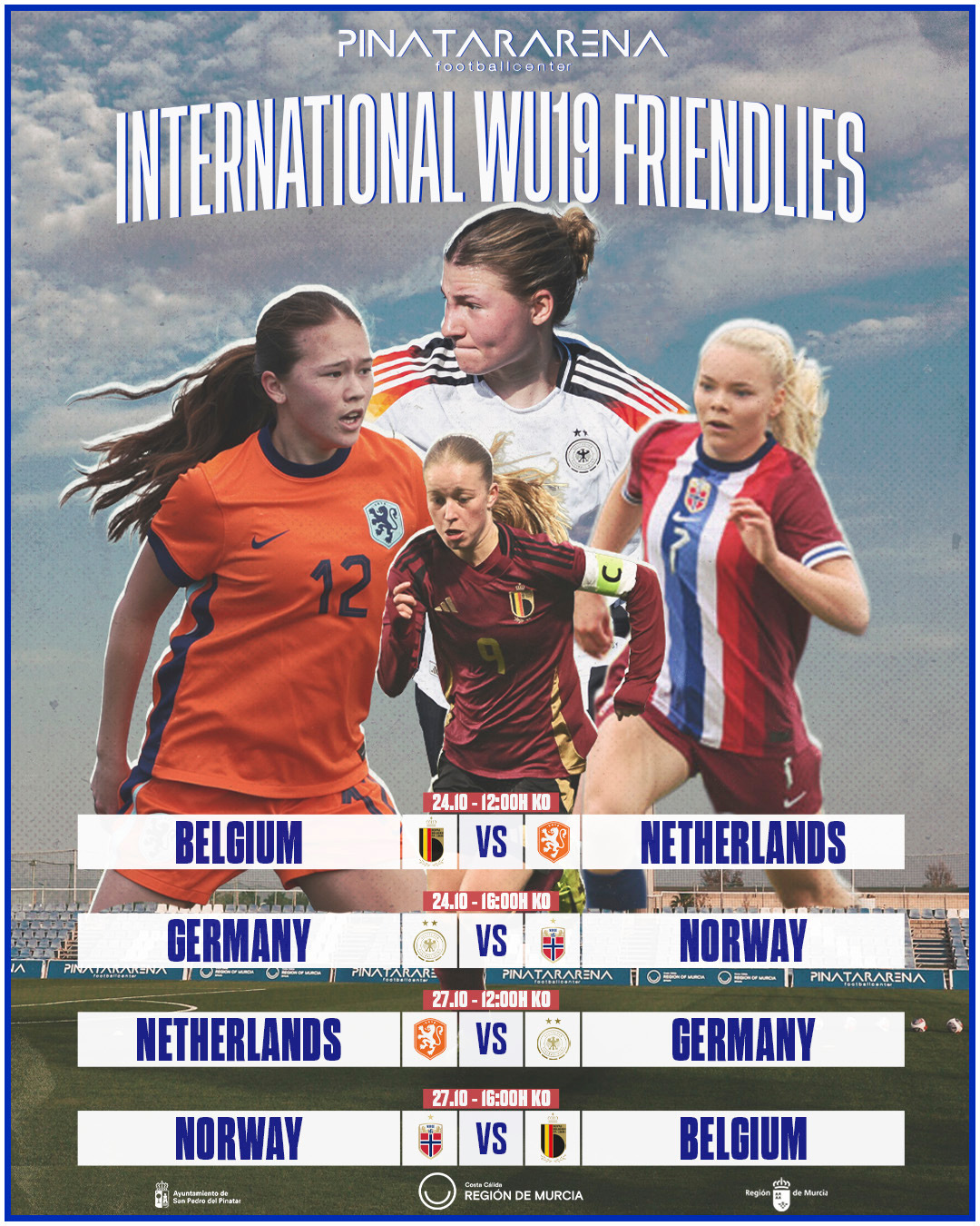 Pinatar Arena continúa con su actividad futbolística anunciando la organización de un torneo amistoso femenino sub-19 que contará con la participación de Noruega, Países Bajos, Alemania y Bélgica Este nuevo evento internacional que se celebrará del 20 al 28 de octubre ofrecerá una excelente oportunidad para seguir de cerca a algunas de las jóvenes promesas del fútbol europeo que buscarán dejar su huella en el camino hacia la élite.