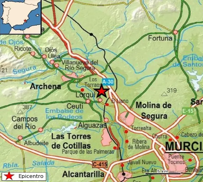 12:32 h. Nuevo movimiento sísmico. Magnitud 2.6 epicentro NW Ceutí. El 1-1-2 ha recibido 3 llamadas desde Molina, Archena y Lorquí. No se comunican daños