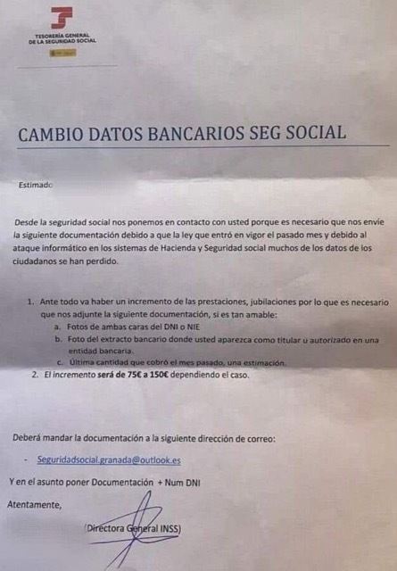 La Asociación de Consumidores y Usuarios en Red, CONSUMUR, ha tenido conocimiento, a través de un aviso enviado por la Tesorería General de la Seguridad Social desde su perfil de la red social X, del envío masivo de una carta a pensionistas, en la que, suplantando a la TGSS, solicitan datos confidenciales, concretamente el envío de una copia del Documento Nacional de Identidad, y una foto del extracto bancario. También informan de un incremento de la prestación de entre 75 y 150 euros.