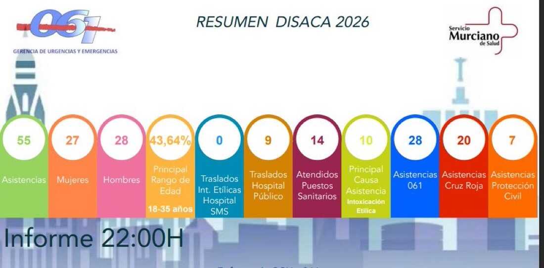 El dispositivo sanitario desplegado en la ciudad de Murcia con motivo del Entierro de la Sardina 2026 llevó a cabo un total de 157 asistencias sanitarias entre las 08:00 horas del lunes 11 y las 03:30 horas del martes 15, según ha informado la Gerencia de Emergencias y Urgencias Sanitarias 061.