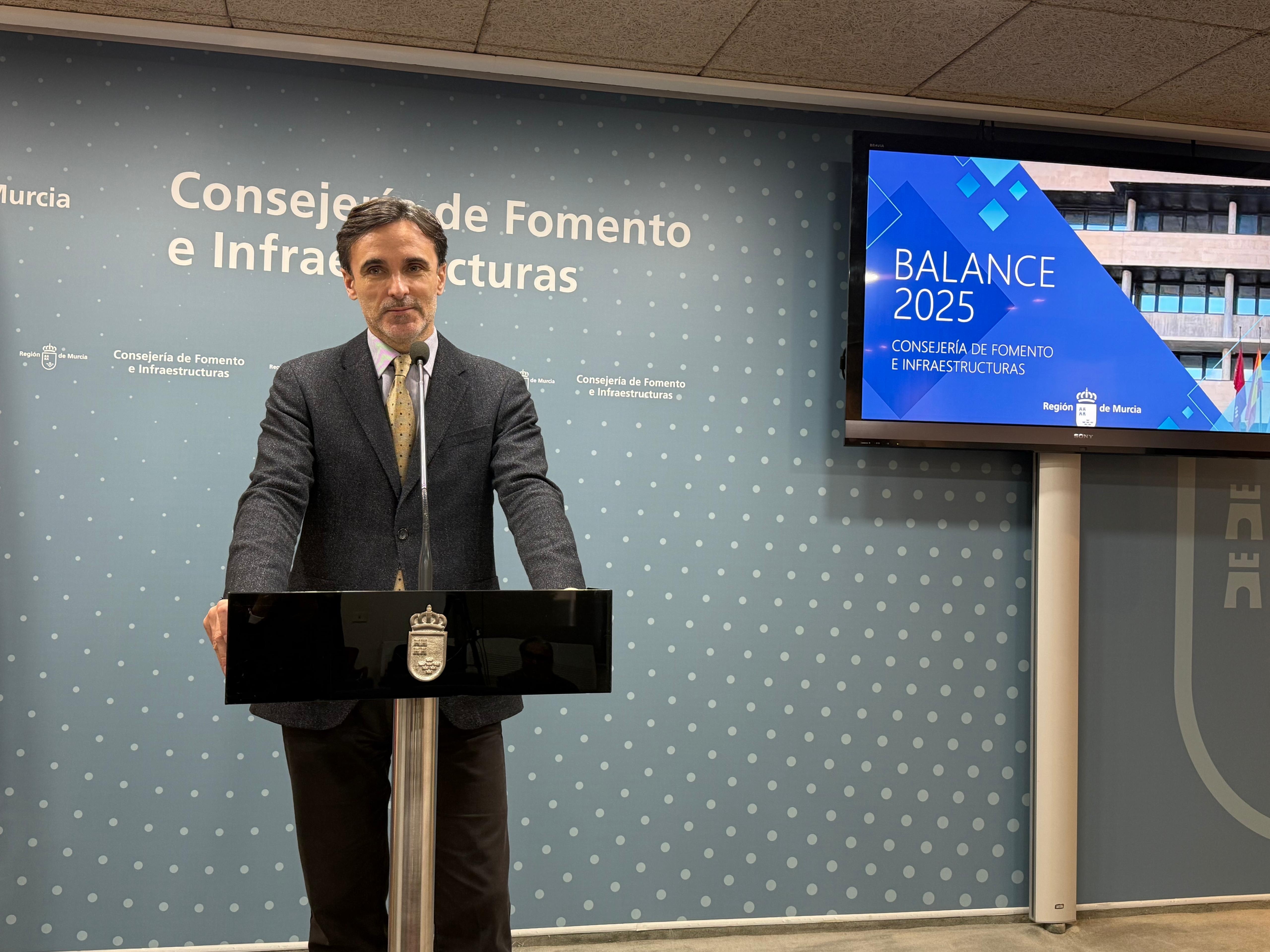 Entre los hitos de 2025, el consejero destacó la aprobación del decreto-ley que regula el transporte público de personas en vehículos de turismo, y el acuerdo para financiar una tercera parte de la ampliación del tranvía de Murcia y el inicio de los estudios para su futura extensión hacia Molina de Segura, Alcantarilla y Santomera.