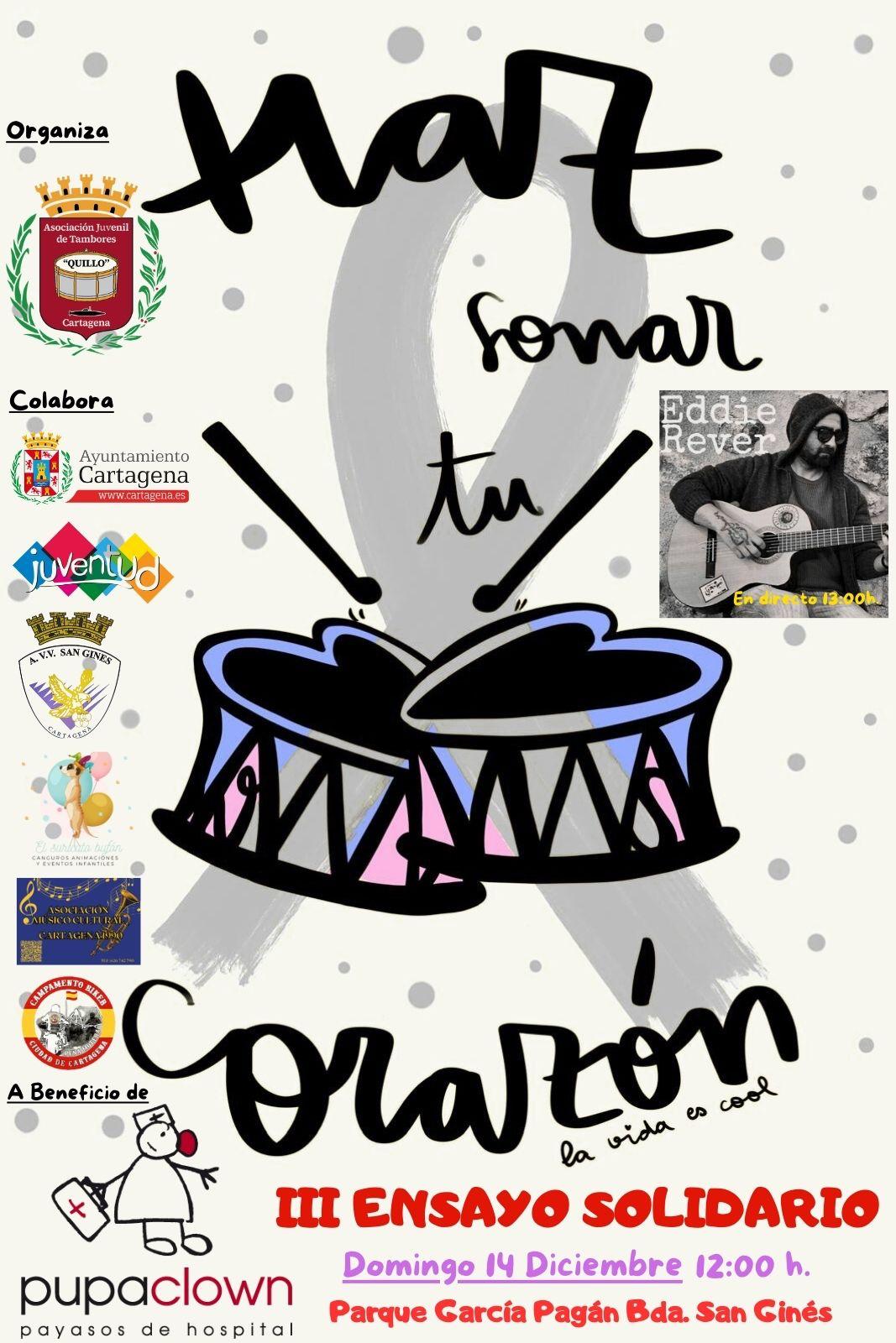 La jornada comenzará a las 11:20 horas en la panadería de San Ginés con una concentración de las Bandas de la Asociación Juvenil Tambores ‘Quillo’ y la Charanga Cartagena 1900, con posterior pasacalles que discurrirá hasta el Parque García Pagán de la barriada San Ginés en el que posteriormente se llevará a cabo el Ensayo Solidario.