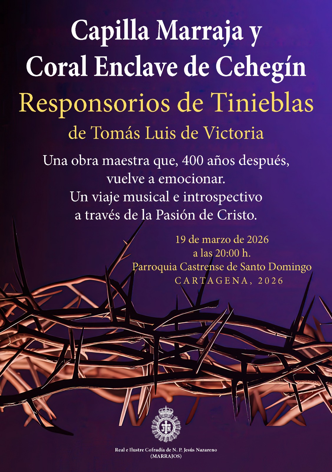El concierto estará interpretado por el Coro de Cámara Capilla Marraja y la Coral Enclave de Cehegín, bajo la dirección de Alfonso Martínez Bernal, y ofrecerá una selección de 13 responsorios del Officium de Tinieblas de Tomás Luis de Victoria, una de las grandes obras del Renacimiento musical.