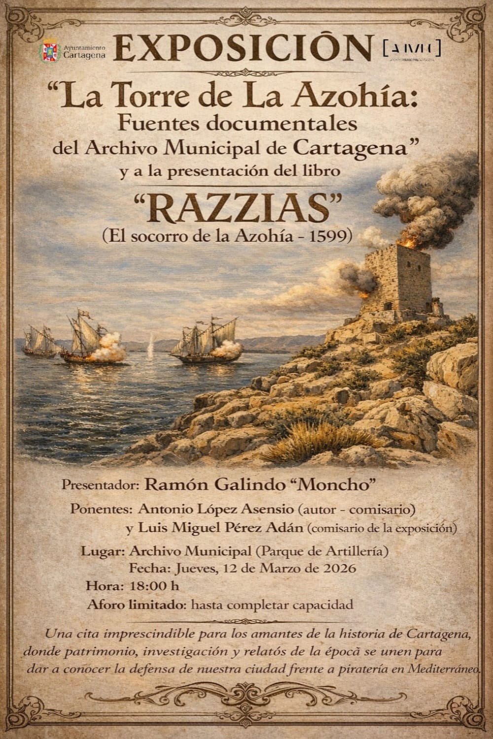 El próximo jueves 12 de marzo de 2026 a las 18:00 horas, el Parque de Artillería de Cartagena será escenario de un acto cultural que combinará investigación histórica, patrimonio documental y literatura. En el evento se inaugurará la exposición “La Torre de La Azohía. Fuentes Documentales del Archivo Municipal de Cartagena”, junto con la presentación de la novela RAZZIAS (El Socorro de la Torre de La Azohía – 1599), obra basada en hechos reales.