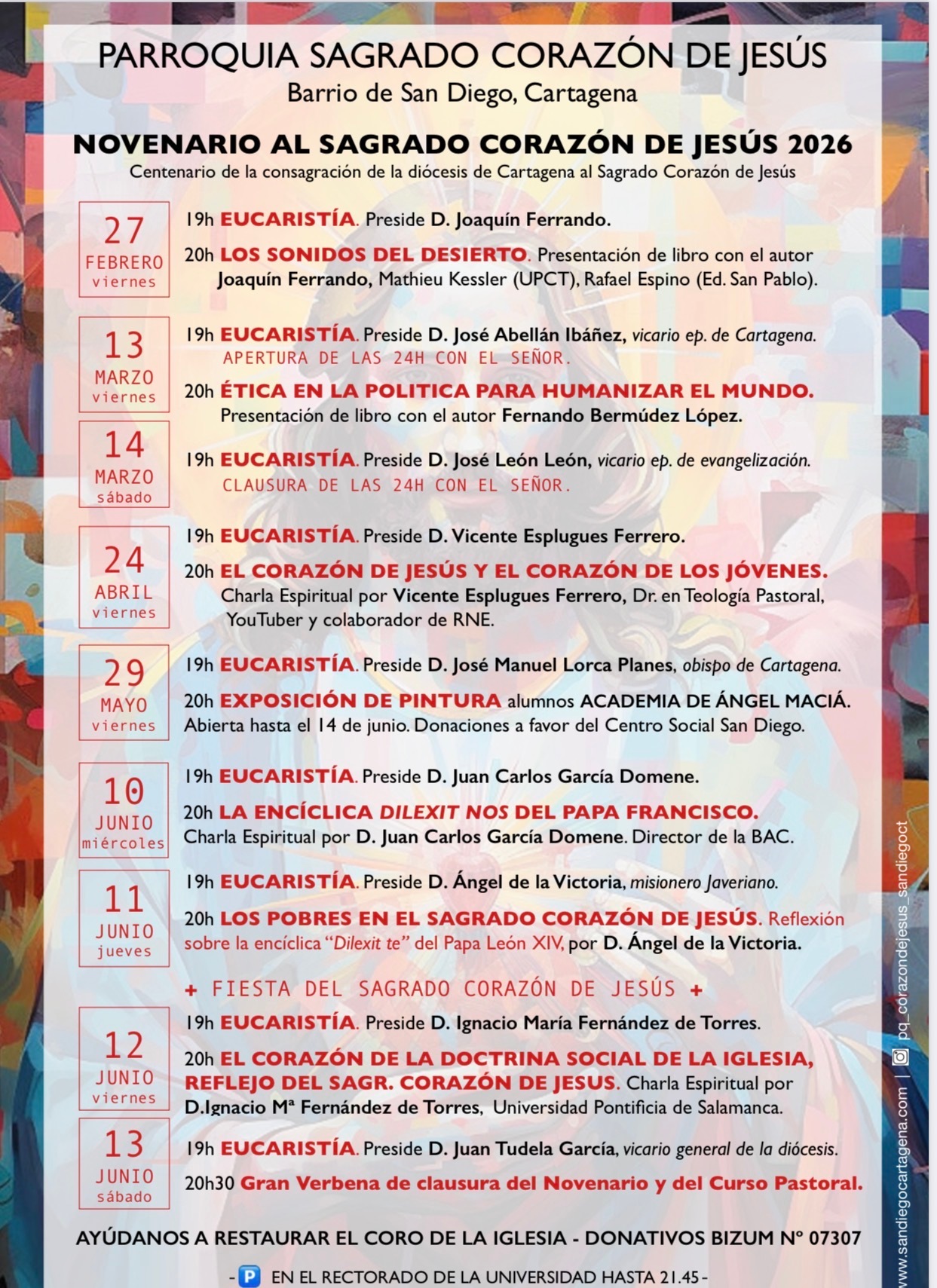 La Diócesis de Cartagena celebra este año el centenario de su consagración al Sagrado Corazón de Jesús, y en este contexto la Parroquia del Sagrado Corazón de Jesús, en el barrio de San Diego, ha organizado un amplio Novenario con actos religiosos, culturales y solidarios. Este programa quiere ser una respuesta de acción de gracias y renovación espiritual en torno a la figura del Sagrado Corazón.