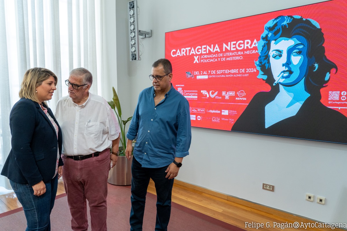 De la presentación de la décima edición de Cartagena Negra, celebrada este jueves en el Palacio Consistorisal, han formado parte la alcaldesa, Noelia Arroyo, el director general de Cultura, Eugenio González, y el director del festival, Paco Marín.