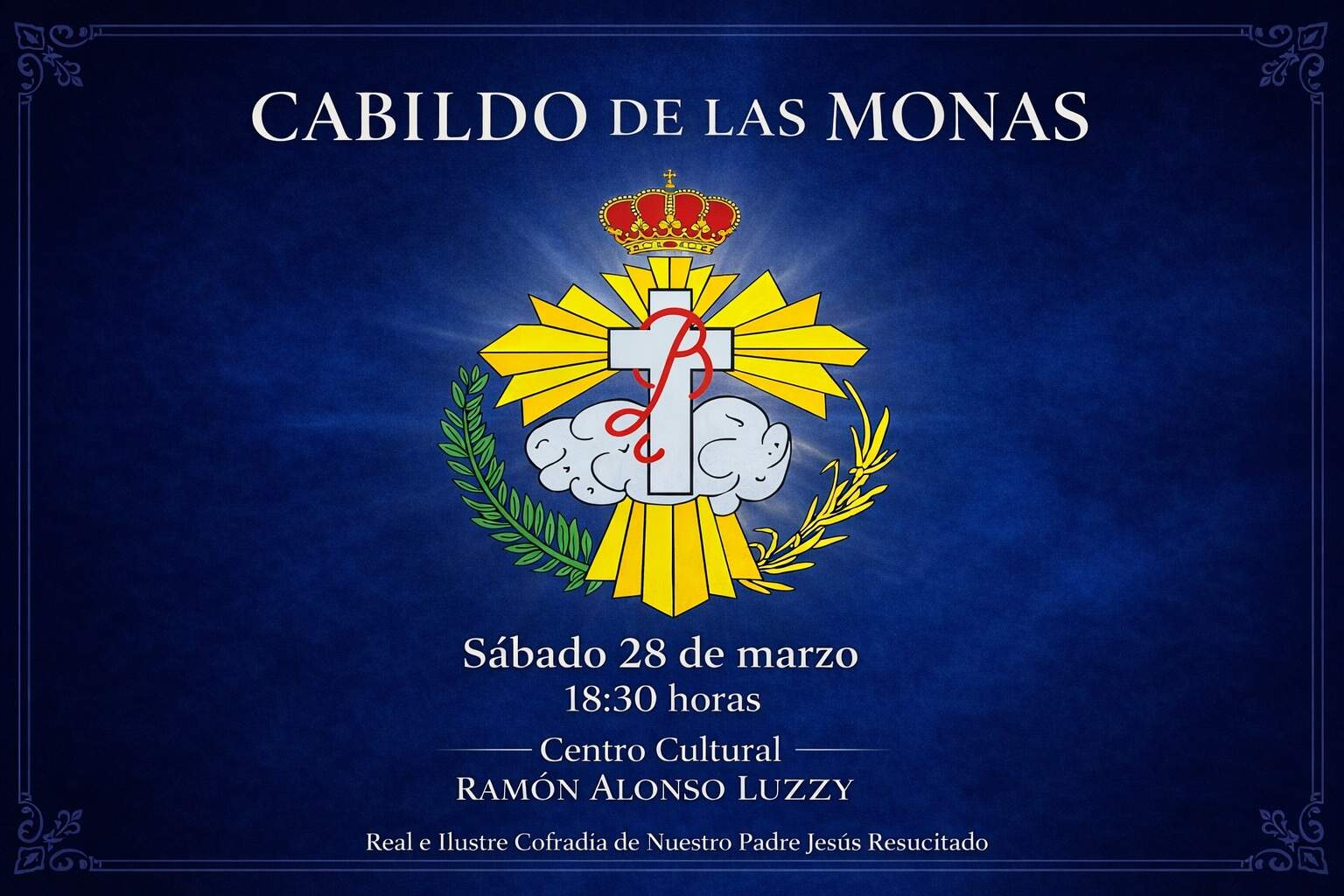 La Real e Ilustre Cofradía de Nuestro Padre Jesús Resucitado celebrará este sábado, 28 de marzo, a las 18:30 horas, el tradicional Cabildo de las Monas, que tendrá lugar en el Centro Cultural Ramón Alonso Luzzy.