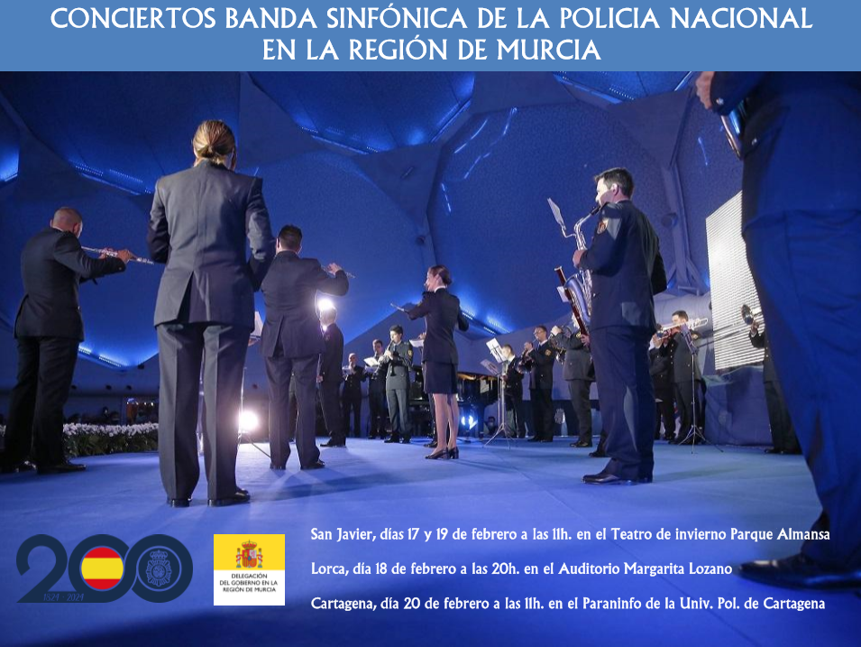 En ese programa anual, la Jefatura Superior de Policía de la Región de Murcia va a ofrecer una serie de conciertos a cargo de la Banda Sinfónica de la Policía Nacional en los municipios de Cartagena, Lorca y San Javier, los próximos días 17, 18, 19 y 20 de febrero. Esta iniciativa se desarrolla por primera vez en la Región de Murcia y los conciertos están dirigidos a colectivos de mayores y alumnos de educación primaria.