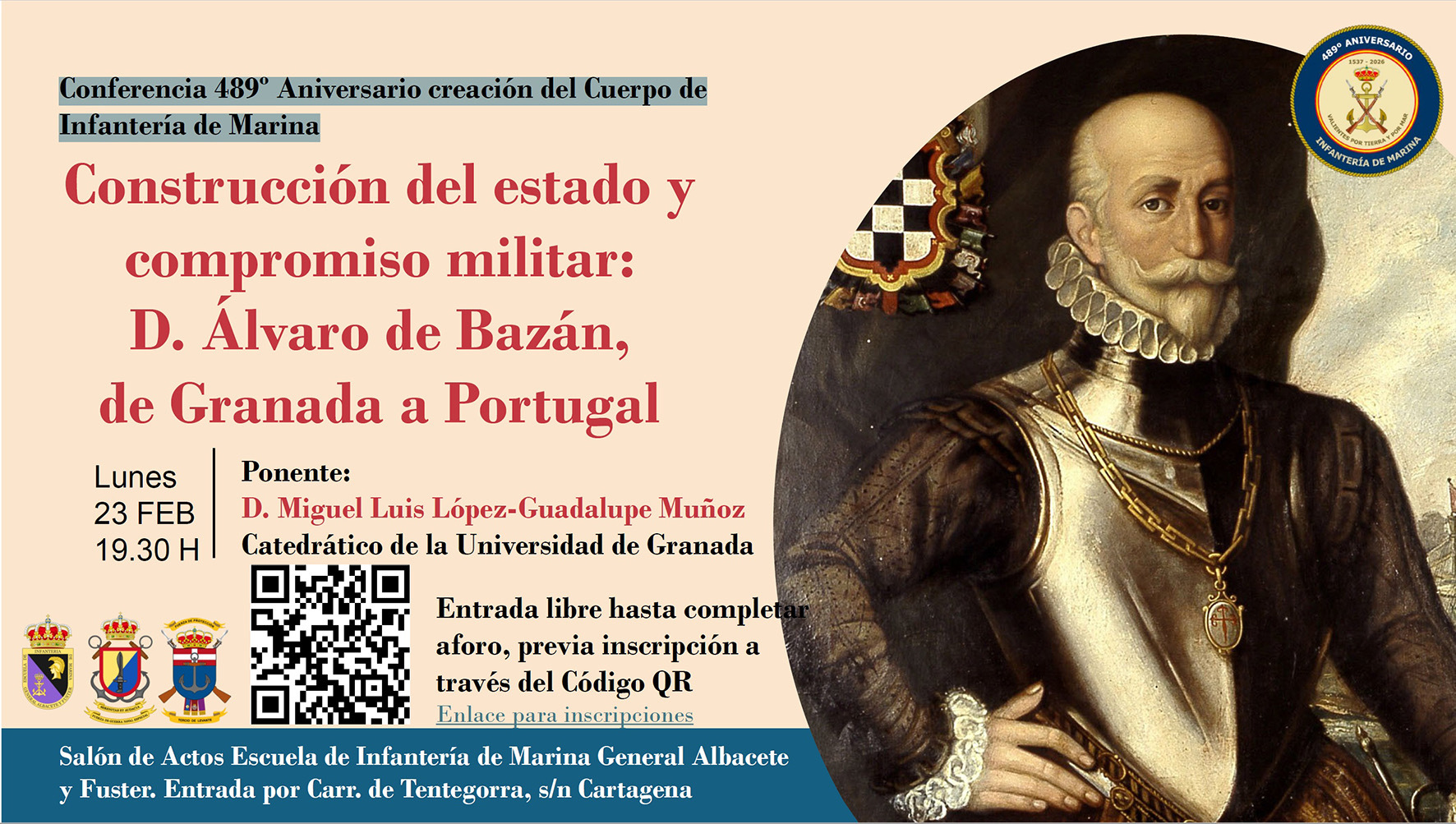 El lunes 23 de febrero en el Salón de Actos de la Escuela de Infantería de Marina General Albacete y Fuster (EIMGAF), se celebrará la Conferencia en el 489 Aniversario creación del Cuerpo de Marina, con la intervención de D. Miguel Luis López-Guadalupe Muñoz, Catedrático de la Universidad de Granada.