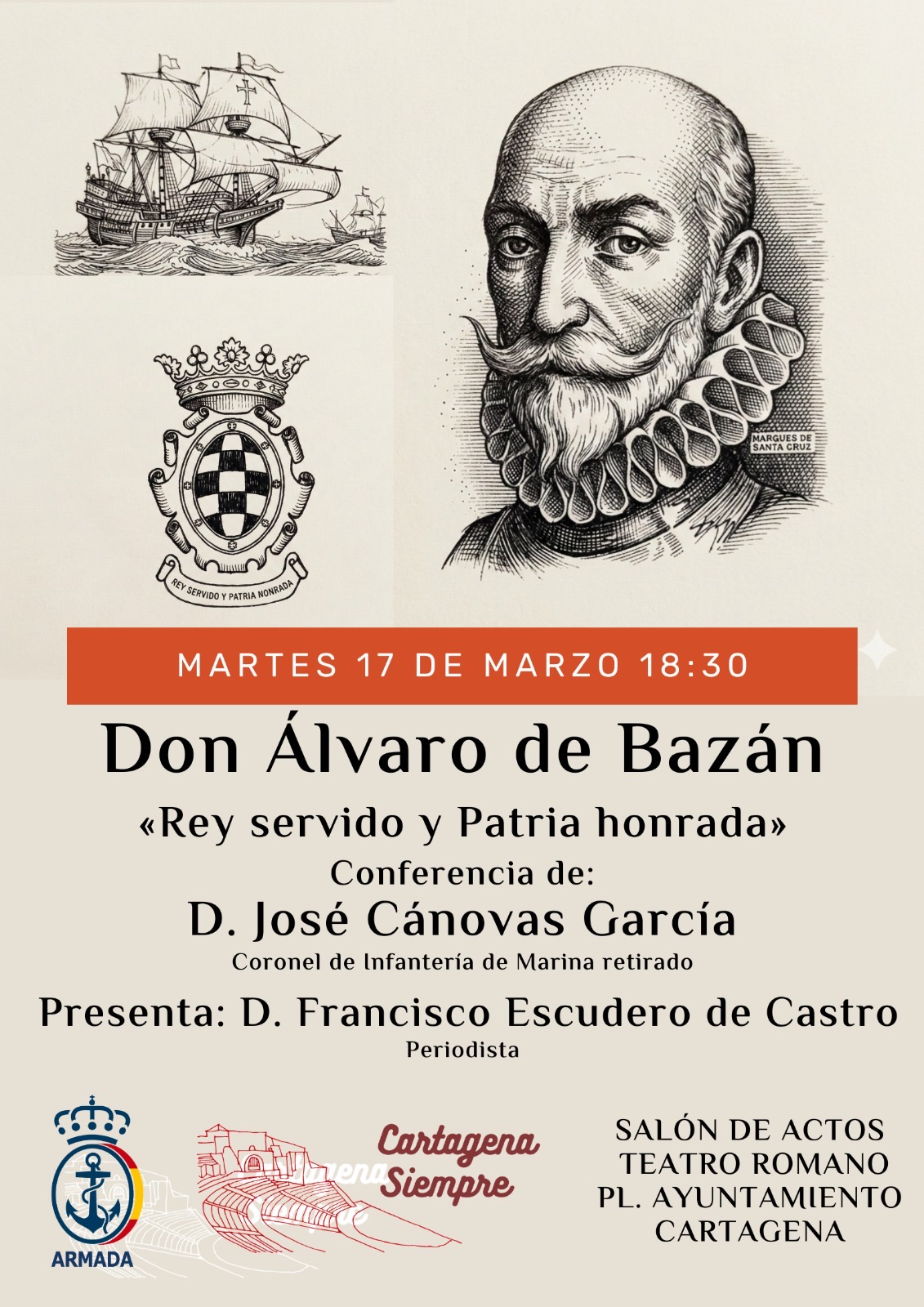 El próximo martes 17 de marzo a las 18:30, el Salón de Actos del Teatro Romano de Cartagena acogerá una conferencia dedicada a una de las figuras más extraordinarias de la historia naval española: Don Álvaro de Bazán, almirante legendario cuyo nombre permanece ligado a la tradición marítima y al poder naval de España durante el siglo XVI.