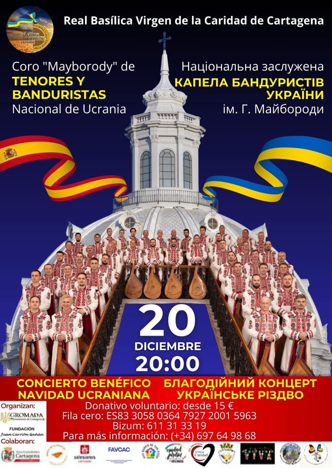 El Coro Nacional de Tenores y Banduristas de Ucrania G.I. Mayboroda ofrece este sábado 20 de diciembre un concierto benéfico en la Real Basílica Virgen de la Caridad de Cartagena, a partir de las 20:00 horas. La actuación, que cuenta con la colaboración del Ayuntamiento, se enmarca gira española, que la agrupación está realizando en España. La entrada es libre, aunque se anima a los asistentes a colaborar con el evento benéfico.