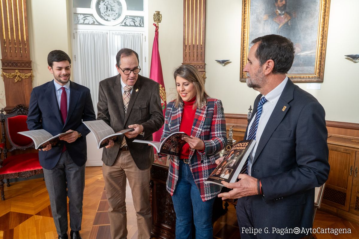 Los Cronistas Oficiales de Cartagena, Luis Miguel Pérez Adán y Juan Ignacio Ferrández García, han presentado este viernes 16 de enero a la alcaldesa, Noelia Arroyo, el libro 'Cien Voces Cartageneras' en el Palacio Consistorial. La entrega se ha realizado en una fecha vinculada a la historia institucional de la ciudad: el aniversario de la concesión del privilegio rodado en 1245 por el infante Alfonso de Castilla, futuro Alfonso X El Sabio, que supone la creación del concejo, antecedente del Ayuntamiento.