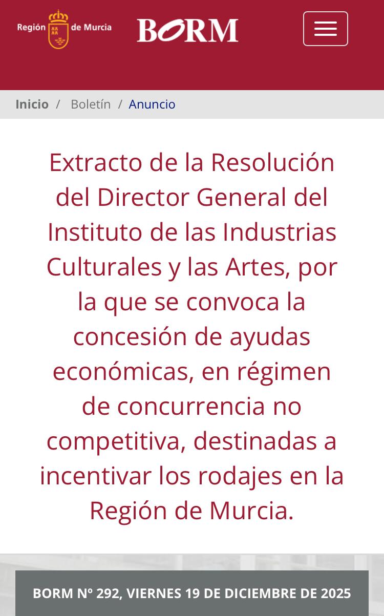 Toda la información de la convocatoria se puede consultar en la edición del Boletín de la Región de Murcia del viernes, 19 de diciembre, y en el apartado de ‘Convocatorias’ de la página web del Instituto de las Industrias Culturales y las Artes.