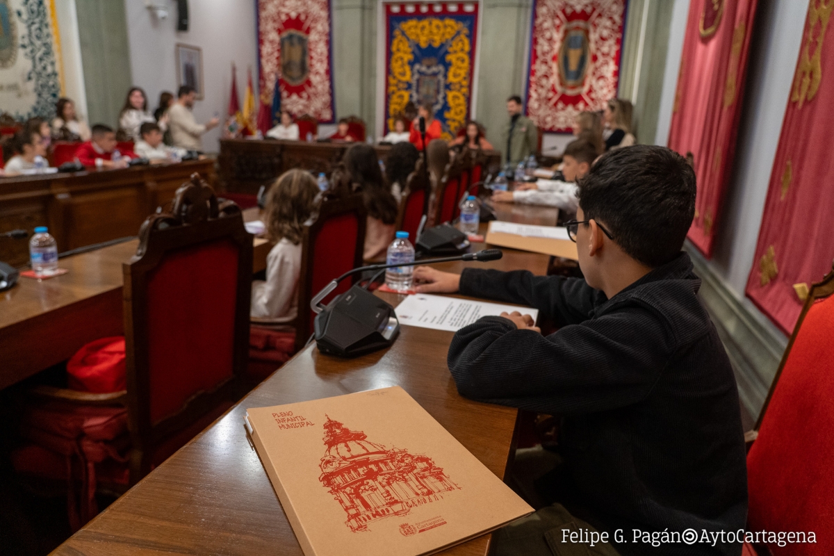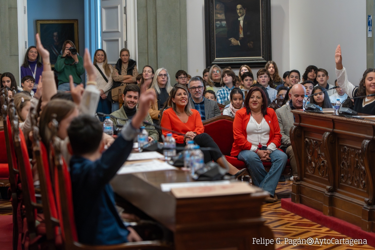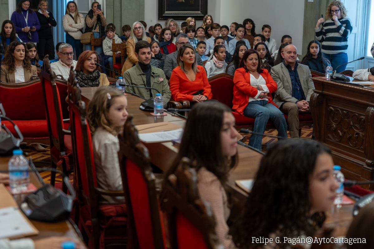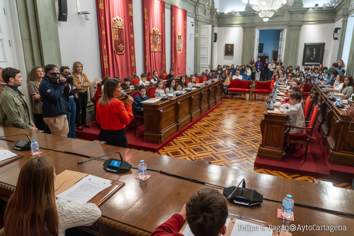 Escolares de Cartagena han celebrado este 4 de diciembre un pleno infantil municipal en el Palacio Consistorial con motivo del Día de la Constitución Española, que cumple su 47 aniversario este 6 de diciembre. Esta edición se ha centrado en su artículo 18: “Derecho a la intimidad”. La sesión ha contado con más de 200 alumnos de público y además se ha podido seguir en directo por Youtube.