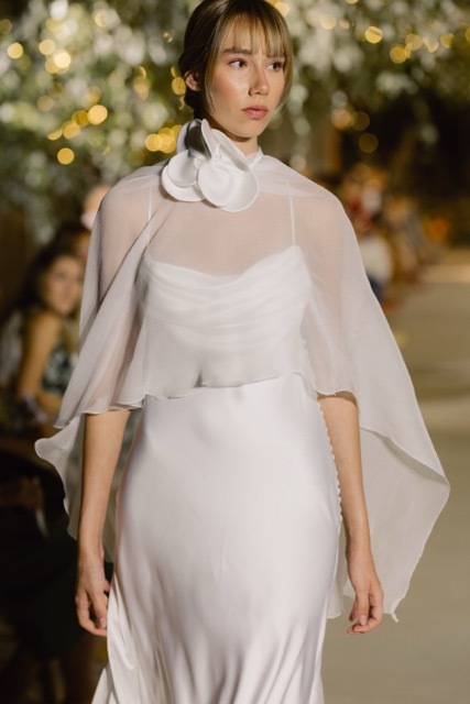 Cayetana Ferrer cerró la sección de invitadas y continuó el desfile destacando las nuevas tendencias para novias que “buscan poder cambiar de look sin cambiar de vestido, teniendo capas, colas y mangas desmontables para aportar más frescura en momentos diferentes”.