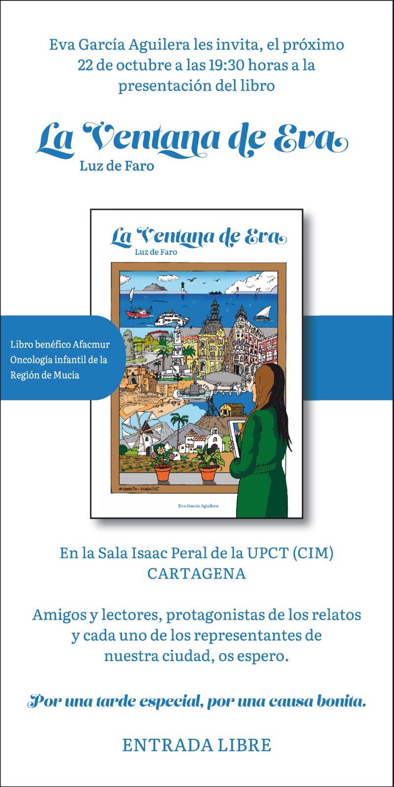 El próximo miércoles 22 de octubre en la sala Isaac Peral de la UPCT, a las 19:30 horas, nuestra colaboradora Eva García Aguilera presenta el libro benéfico para oncología infantil, La ventana de Eva, Luz de faro.