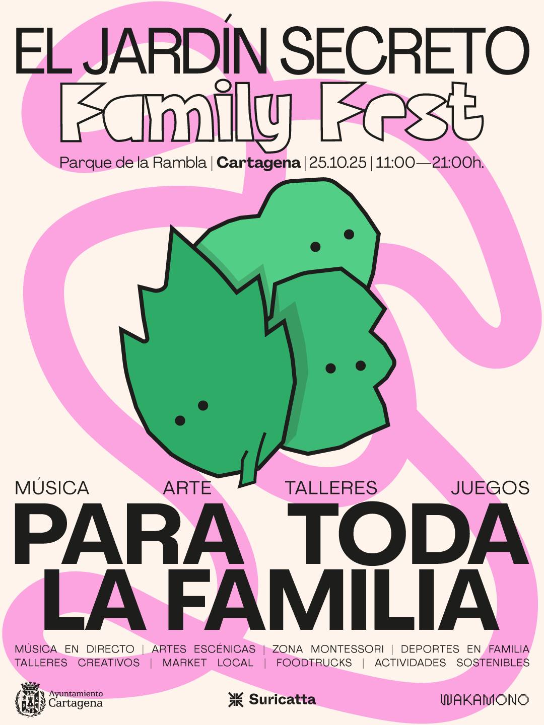 El Parque de la Rambla de Cartagena se convertirá el próximo 25 de octubre en un gran espacio para la convivencia y la imaginación con la primera edición de El Jardín Secreto Family Fest, una propuesta pionera que une música, arte, naturaleza yjuego en una misma jornada dedicada a las familias. Un festival coorganizado por Suricatta y el Ayuntamiento de Cartagena. Las entradas, que tienen un precio de venta anticipada hasta el 17 de octubre de entre 5 y 10 euros, se pueden adquirir en la web wwww.family.jardinsecretofest.com.