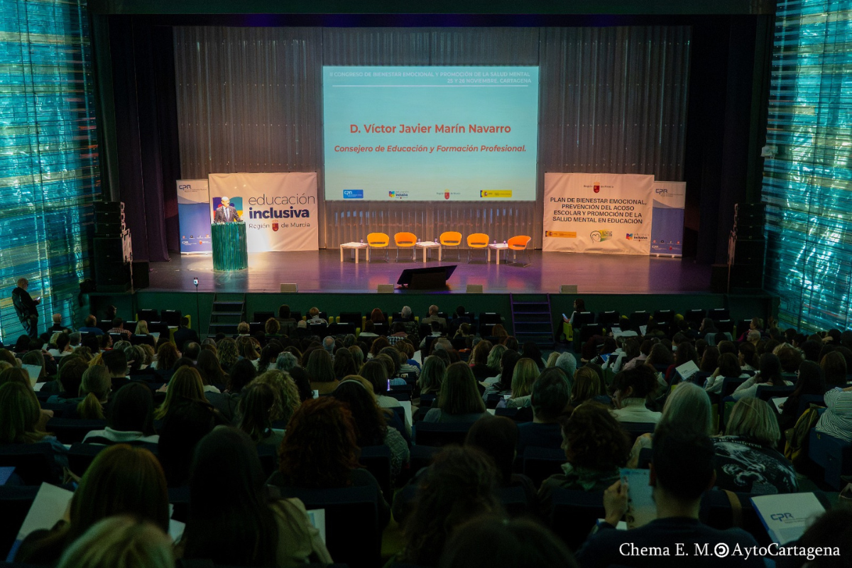 Más de 1.400 profesionales del sector educativo se dan cita en el auditorio El Batel de Cartagena durante el II Congreso de bienestar emocional y promoción de la salud mental. El concejal de Educación, Ignacio Jáudenes y el consejero de Educación, Víctor Marín, han asistido al evento, que se celebra los días 25 y 26 de noviembre. Docentes y responsables del área de Educación del Ayuntamiento también han estado presentes en la iniciativa.